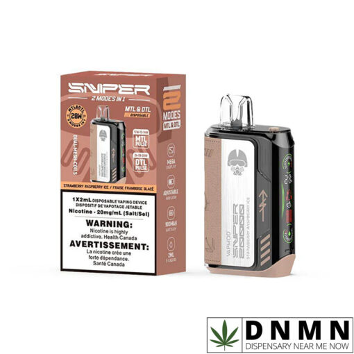 Strawberry Raspberry Ice by Sniper is a premium disposable vape from Vapmod, featuring a 30ml e-liquid capacity with 20mg nicotine strength in a sleek, colorful design. It combines the vibrant sweetness of ripe strawberries with the tart brightness of fresh raspberries, elevated by a crisp icy menthol layer for a refreshing chill on every puff.